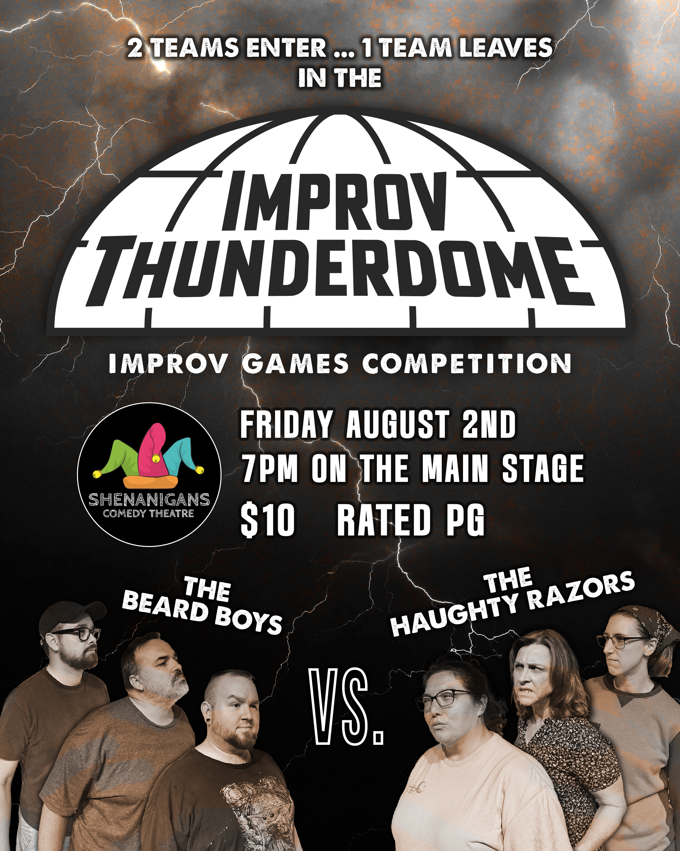 Improv Thunderdome is what it sounds like - improvisers battling it out for audience approval. To convey the message of what this show was, I created a “thunderdome” logo with a bold font and placed it against a chaotic lightning storm. Additionally, I leaned into the “fight” theme and created a poster variant that was reminiscent of old boxing posters.