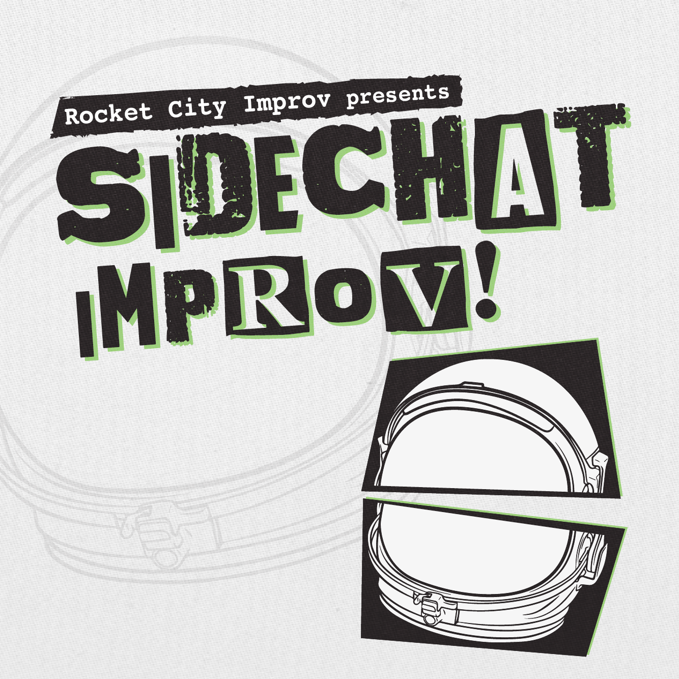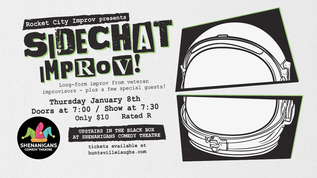Rocket City Improv’s monthly Sidechat show is a night of long-form, Chicago style improv that presents itself with a very underground, DIY attitude. To help convey this, I chose a punk-infused ransom letter typeface, with a broken astronaut helmet as a nod to the Rocket City.
